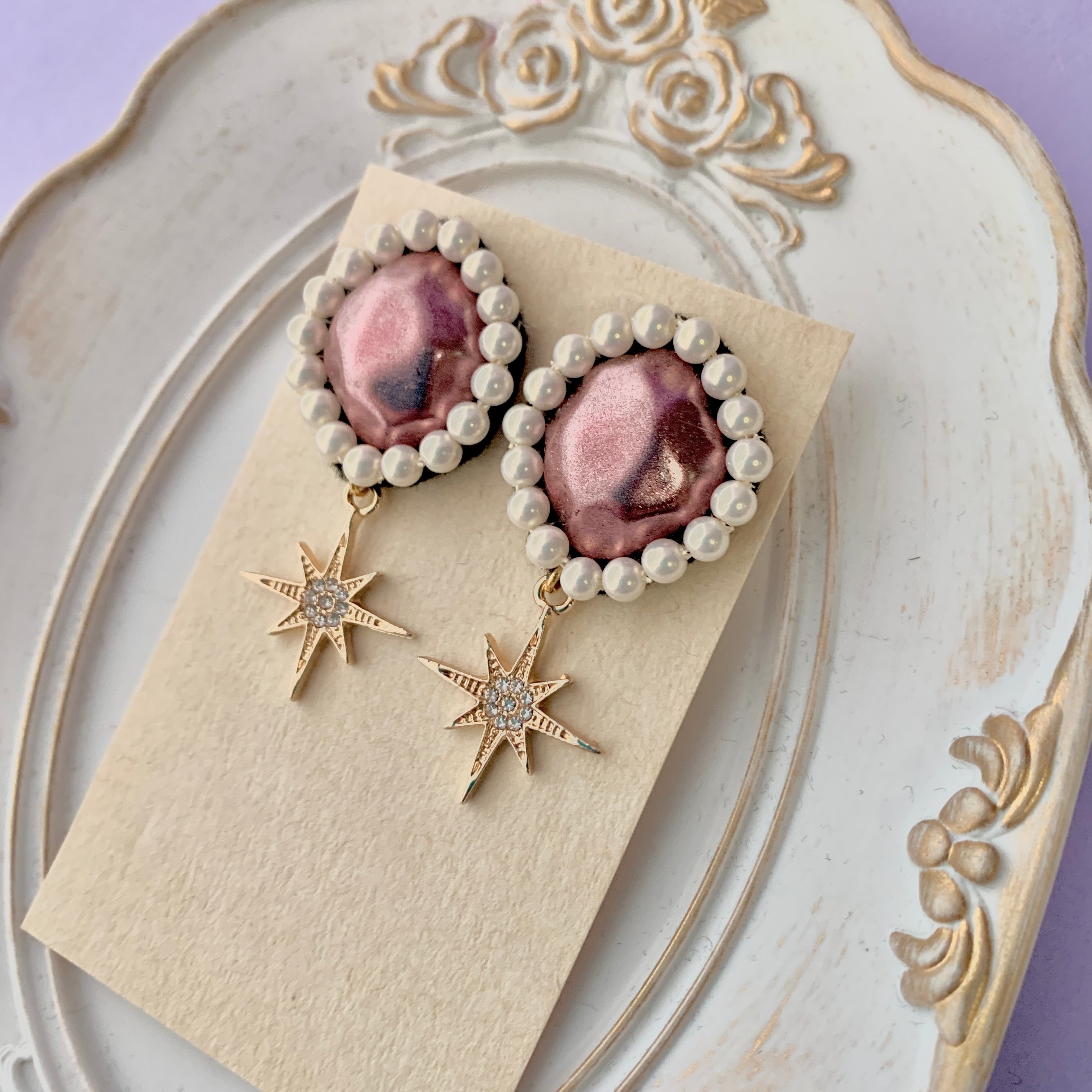 こちらの作品は金属アレルギーの方も安心してご使用できるよう、イヤリングはニッケルフリーのパーツ、ピアスはサージカルステンレスのパーツを使用しておりますが、お肌に合わない可能性もございますのでご確認の上ご使用ください。